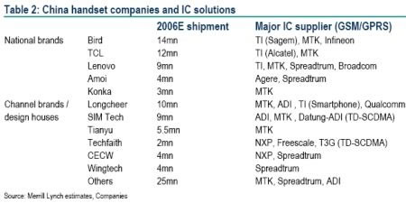 在這份報告中,展訊通信(Spreadtrum Communication)以10%的市場份額和ADI并列第三位。Merrill Lynch指出,展訊通信在2005年Q4發(fā)布SC6600D后,贏得了很多design-win,出貨量在2006年Q2迅速躍升至每個月100萬片。目前采用展訊方案的既有聯(lián)想和夏新這樣的品牌手機廠商,也有上海聞泰和CECW這樣的手機設計公司。
